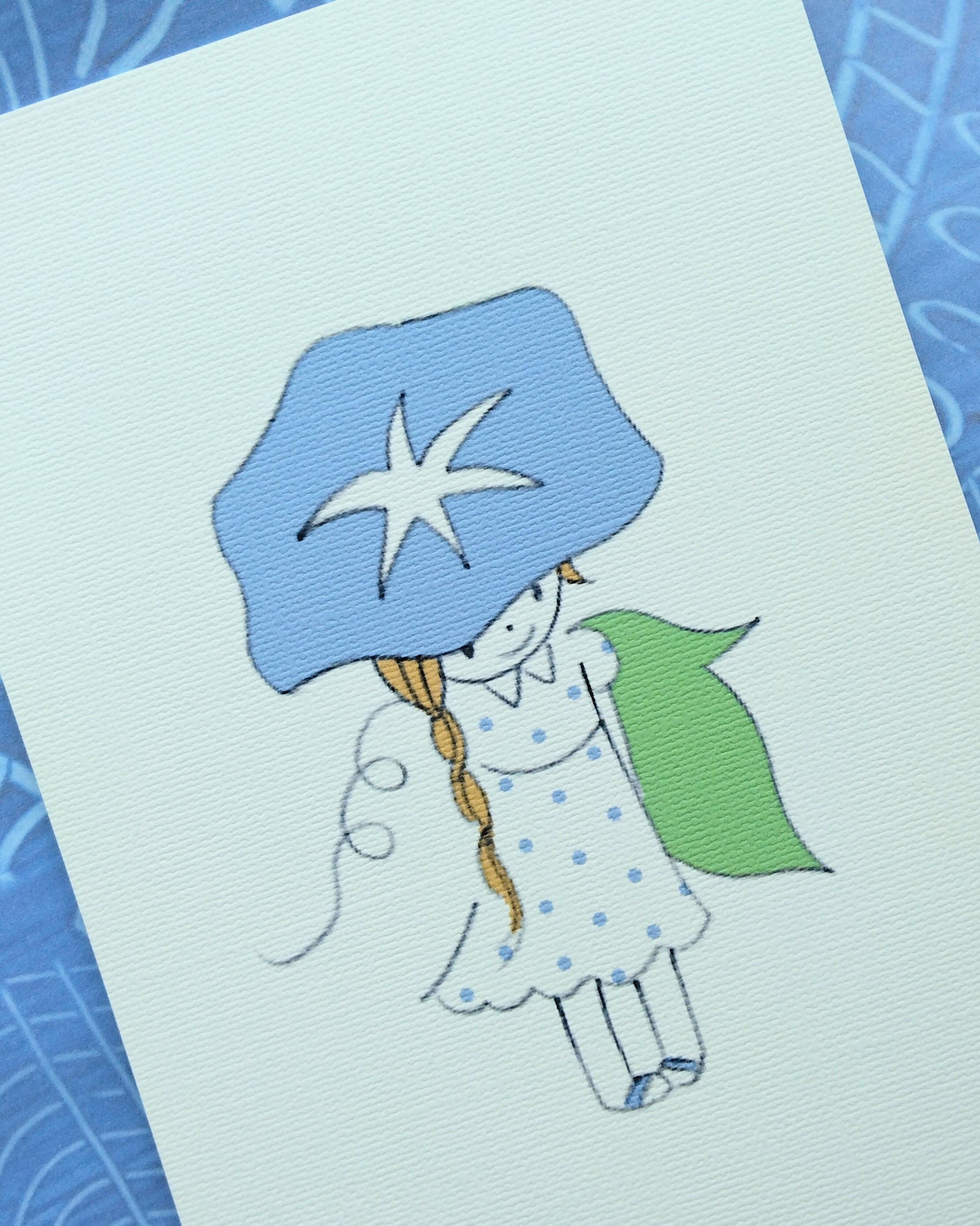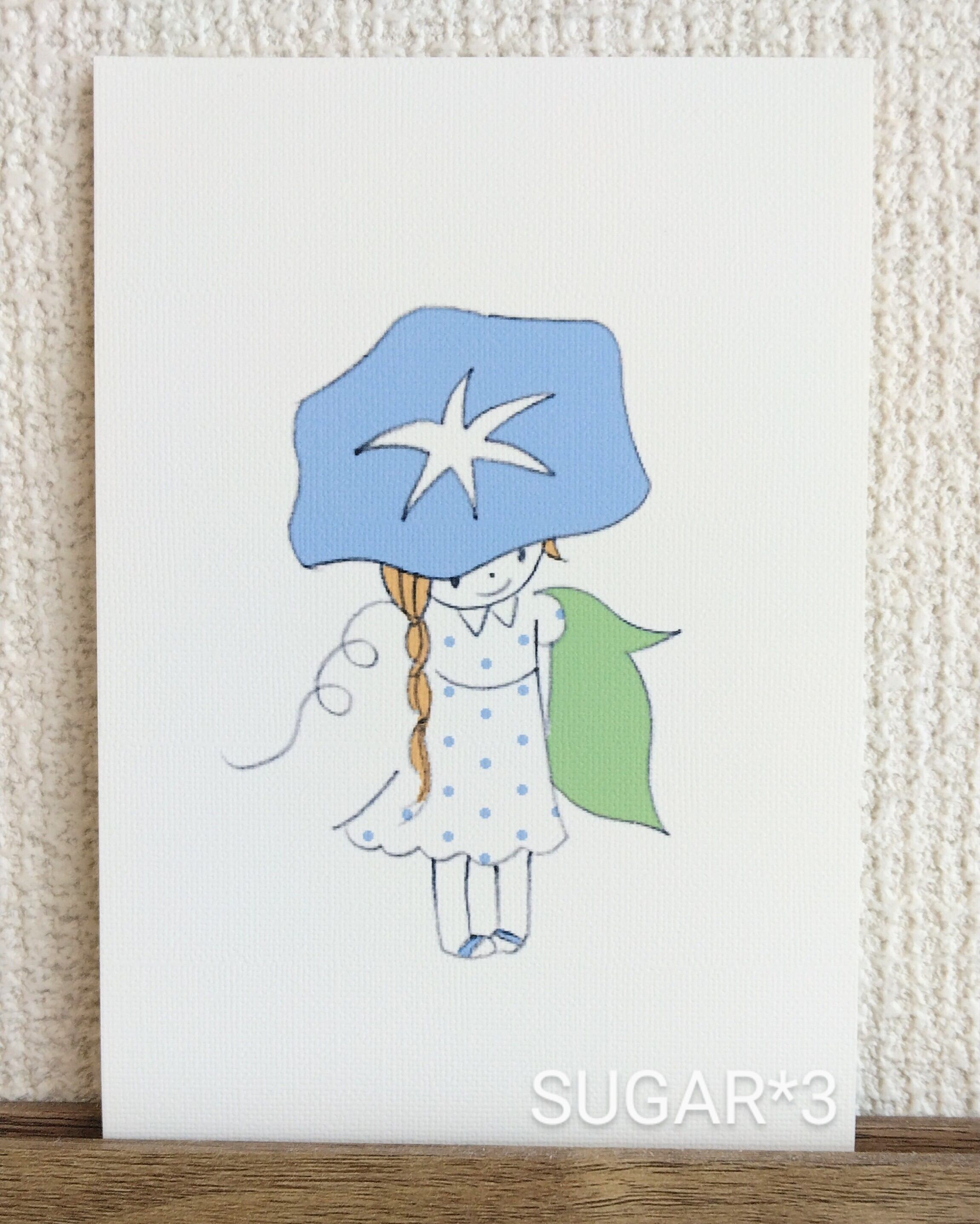 揺れるワンピース。優しい笑顔のあさがおさん。暑い夏に、爽やかな風が吹いてきそうなポストカード。原画は鉛筆にPC着色。涼やかな色合いで、可愛らしさとともに安らぎを。お部屋のインテリアや暑中見舞いにもどうぞ。