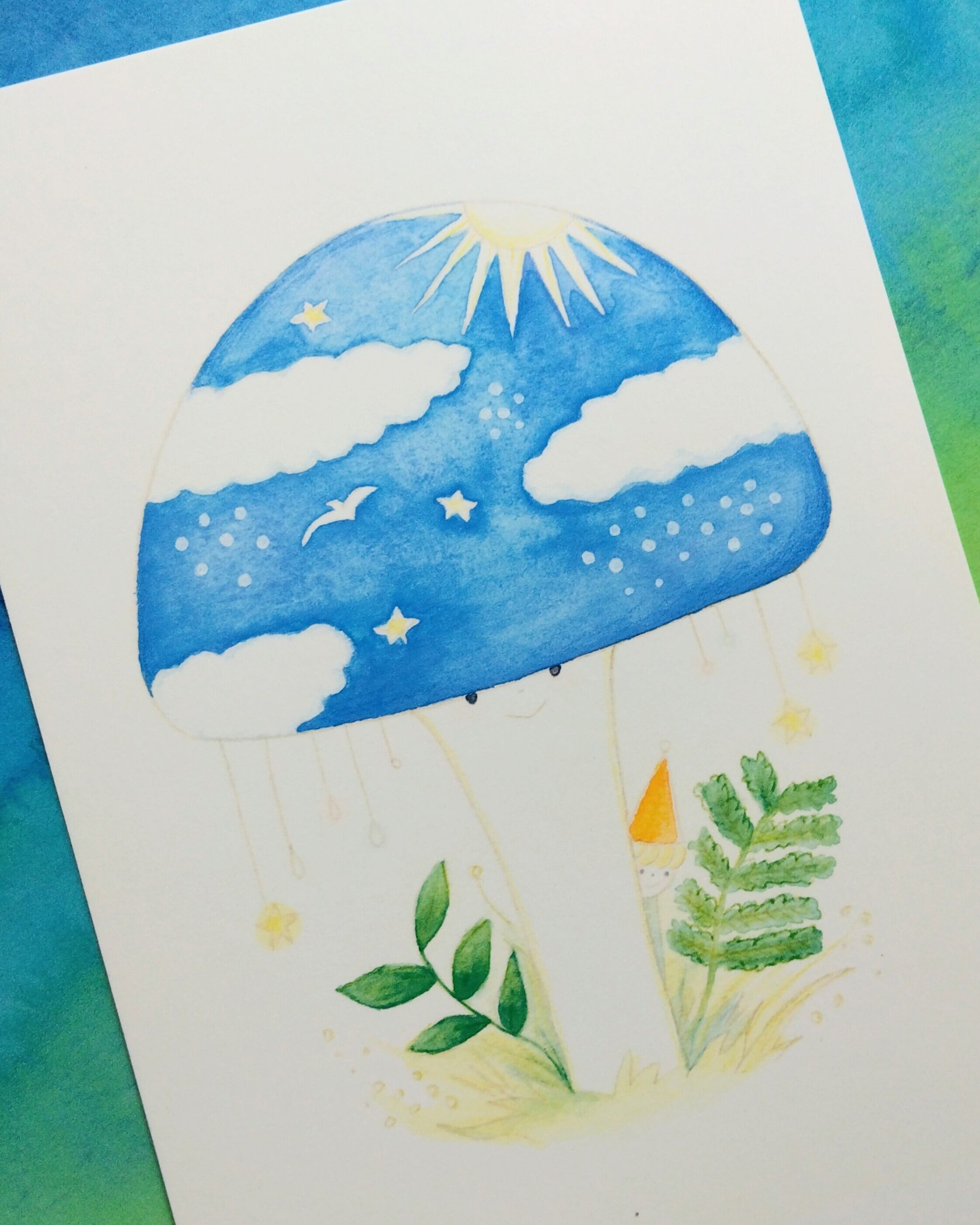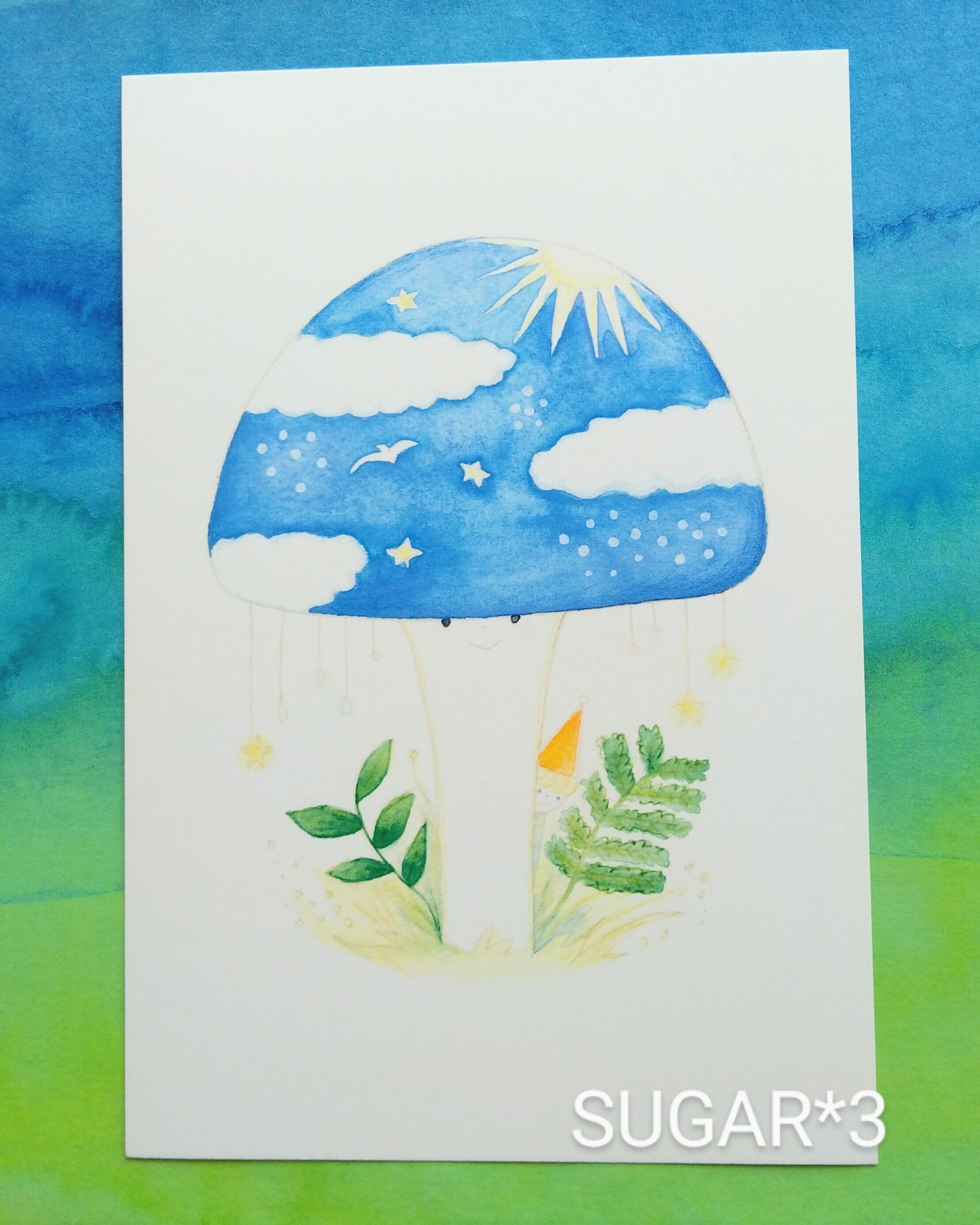 森の奥に生えている特別な青空キノコは、小さな住人のお気に入り。原画は水彩画。たぶん食べることもできますが、まずは空をじっくり眺めてくださいね。暑中見舞いや、お部屋のポイントにも。