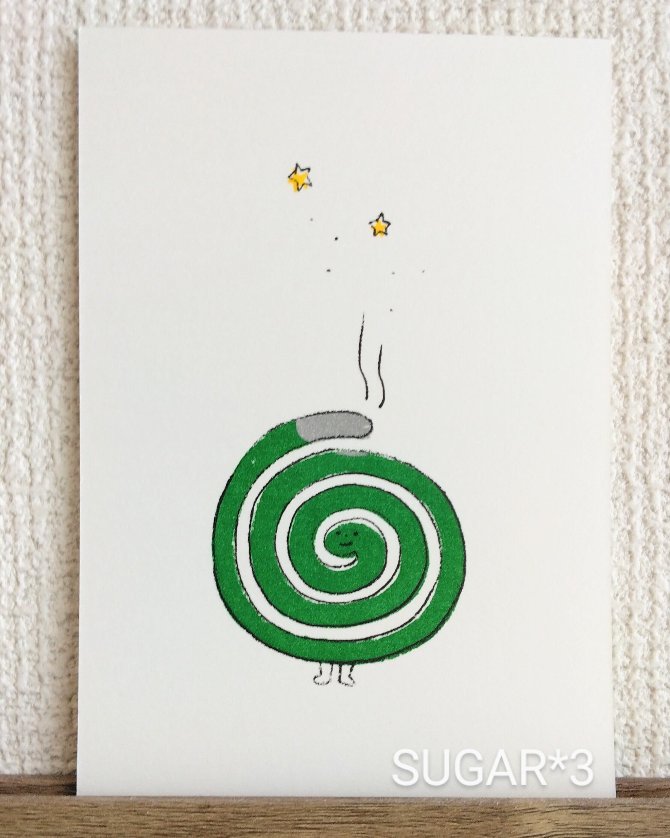 蚊取り線香のカトリンといいます。この渦の中に宇宙の謎が隠されている…かもしれません。懐かしのプリントゴッコで1枚1枚手刷り。夏のお便りにぴったりです。