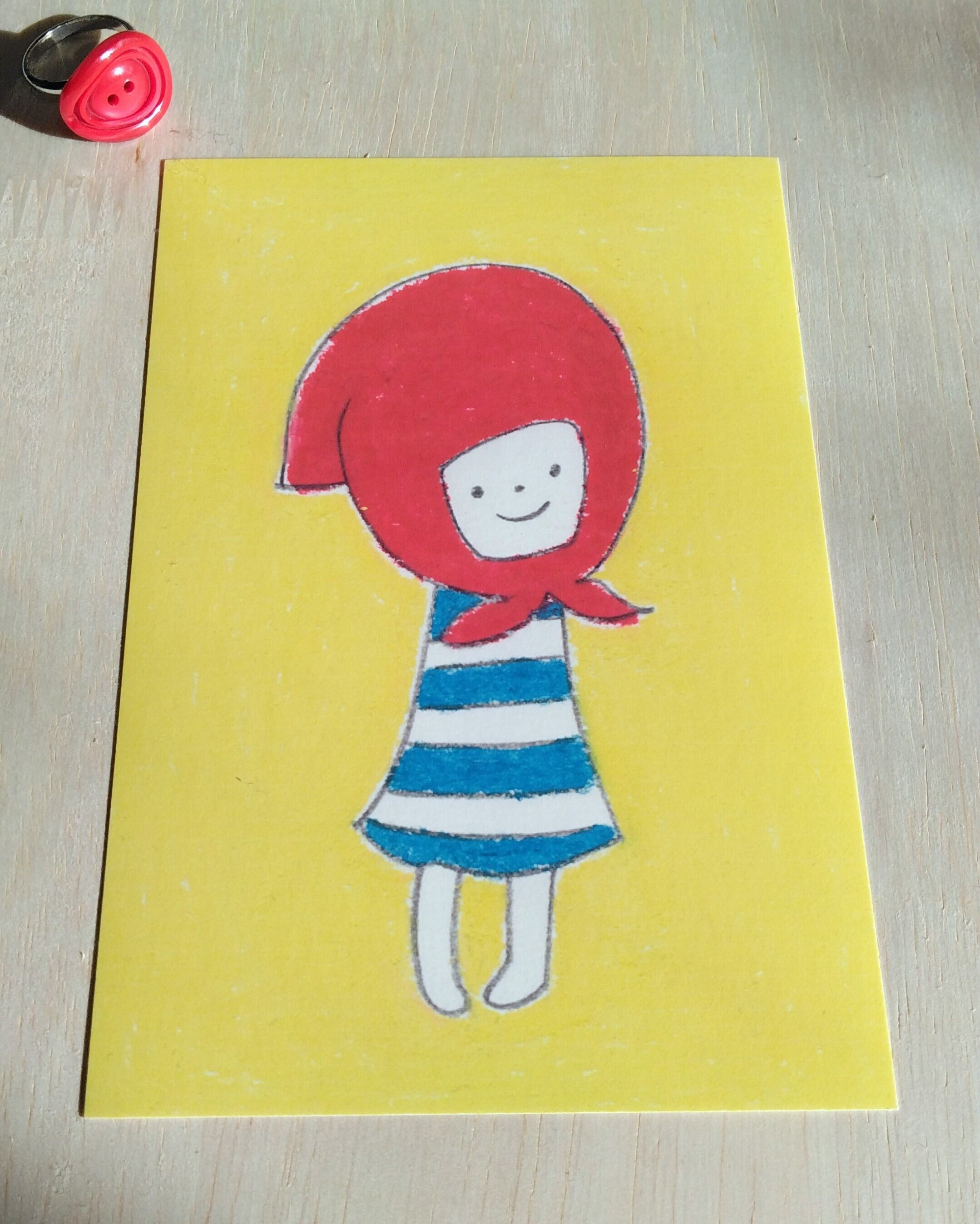 真っ赤な色が愛らしい、ずきんちゃんのポストカード。原画は鉛筆とクレパス。明るくキュートな笑顔をお届けします。お友達へのメッセージや、模様替えのポイントに。
