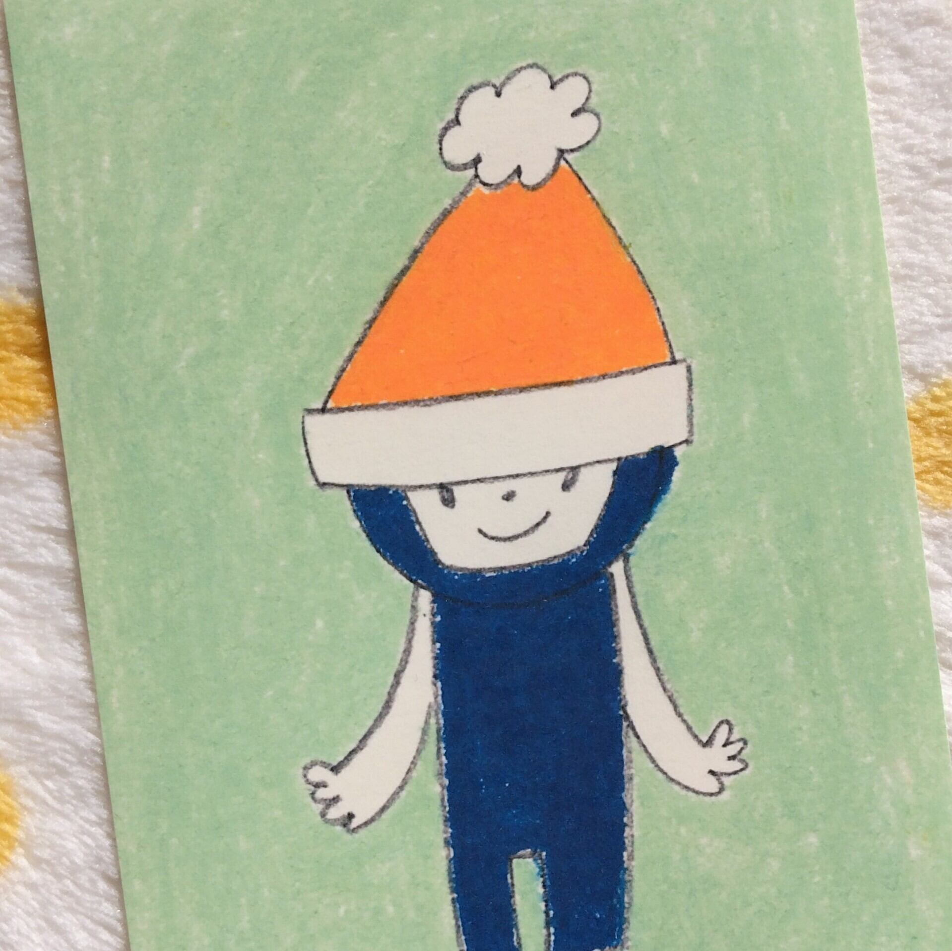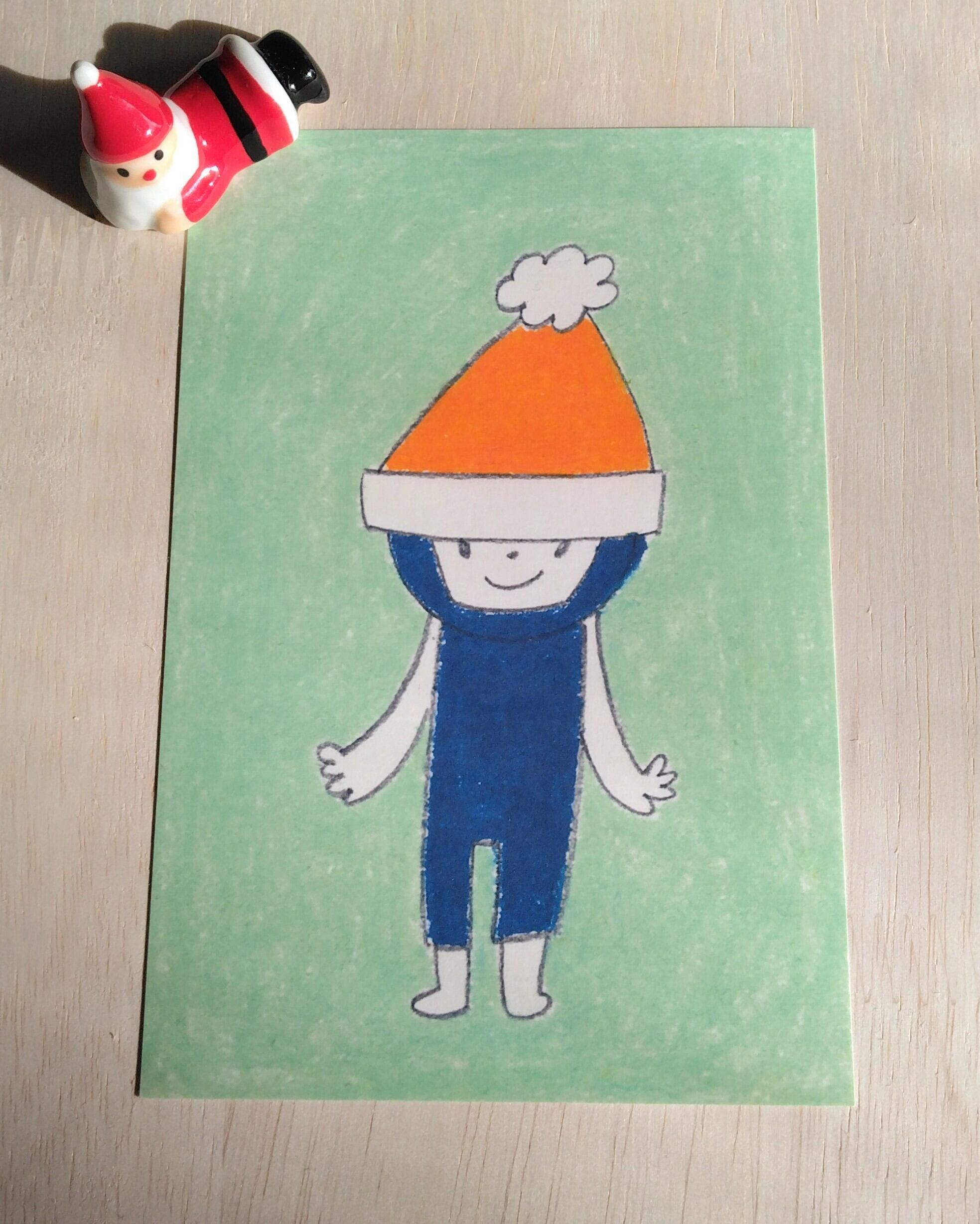 ニットくんの帽子は、サンタさんからのプレゼントなんですって。あたたかな色をまとえばルンルン気分。原画は鉛筆とクレパス。クリスマスのメッセージや、お部屋のアクセントにもどうぞ。